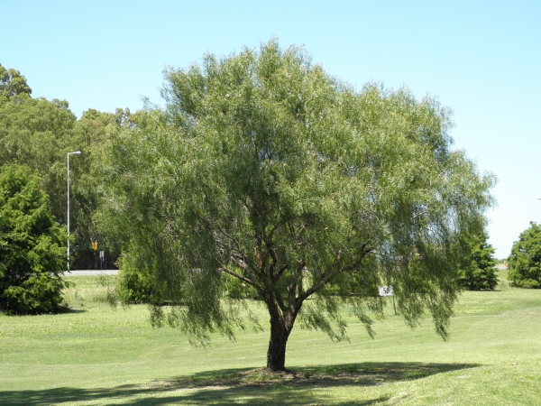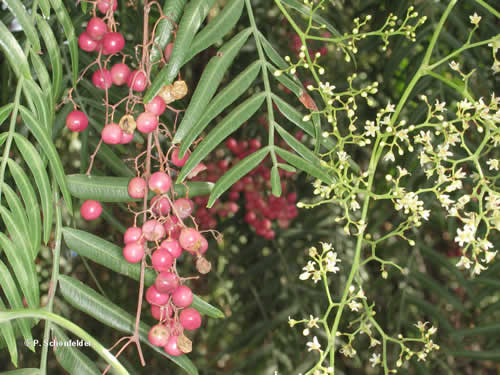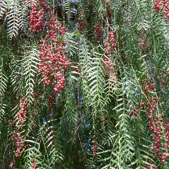 Es nativo de América del Sur, donde crece de forma silvestre en el centro y norte de la República Argentina, desde la provincia de Córdoba hasta Jujuy. Por su valor como ornamental se ha introducido en zonas templadas y cálidas de todo el mundo. Otros nombres comunes que recibe son: molle, molle del Perú (Catamarca), molle de Bolivia (Jujuy), molle de Castilla (Jujuy y Bolivia), gualeguay, pimiento, pimentero, árbol de la pimienta, terebinto, pimiento del diablo, bálsamo, curanguay y mulli. En México, donde la especie está asilvestrada, sus nombres comunes incluyen: pirul, árbol del Perú, molle, peloncuahuite y copalastle. Debido a que el fruto se consume como sucedáneo, o reemplazo de la pimienta, en las provincias del centro de la Argentina se lo denomina falso pimiento, y en la cocina latinoamericana tiene lugar específico.