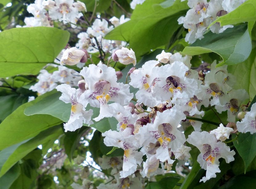 Las catalpas crecen de 10 a 25 m de altura y se las reconoce por sus muy grandes hojas acorazonadas trilobuladas, con flores blancas o amarillas en amplias panículas, y en otoño por sus frutos de 20 a 50 cm de longitud que recuerda a una legumbre, conteniendo numerosas y pequeñas achatadas semillas, cada semilla con dos alas delgadas que ayudan a su dispersión eólica. Debido a sus hojas, se la confunde con el tong.