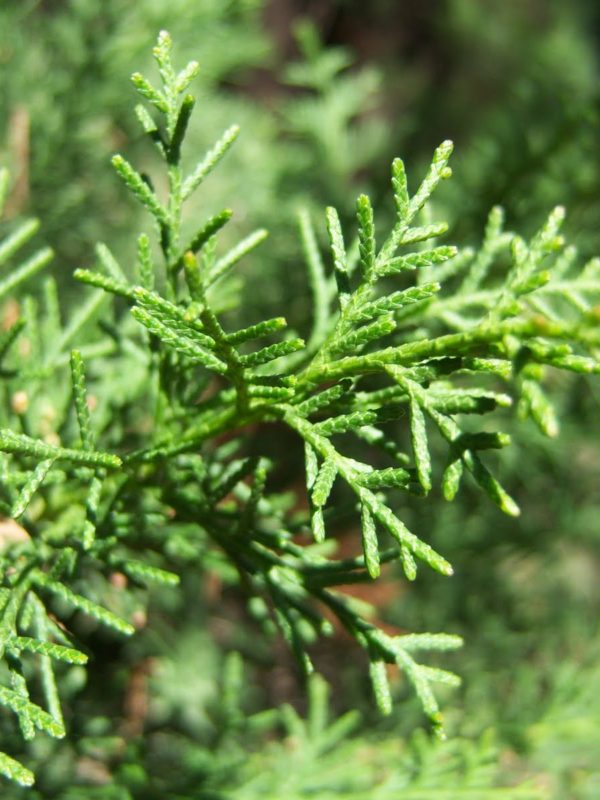 Las hojas pequeñas,cortas y escamiformes, (2-6 mm de longitud) con forma de escama, alineadas en parejas opuestas y decusadas.De color verde oscuro y olor a limón al estrujarlas, están pegadas a los tallos formando cuatro hileras. Los conos, casi esféricos, miden 2,5-4cm de longitud y están formados por escamas grandes que en el centro tienen una protuberancia curvada.